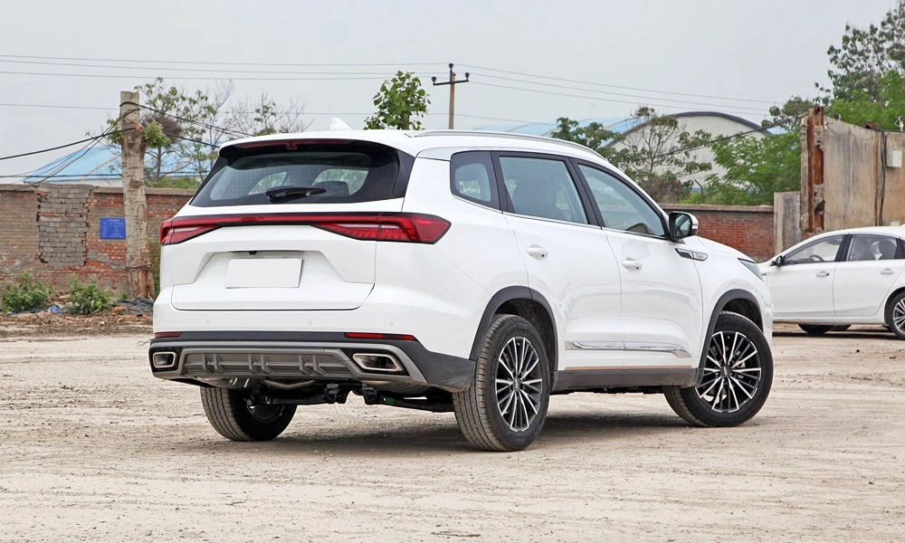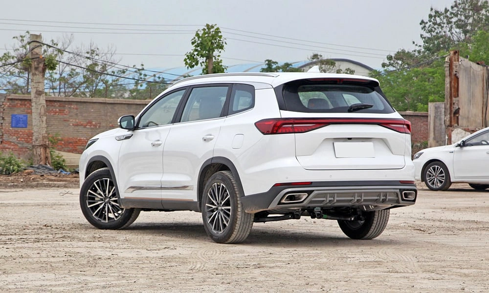 Открытый выхлоп, разнесенные две трубы с левой и правой стороны с прямоугольной накладкой в бампере